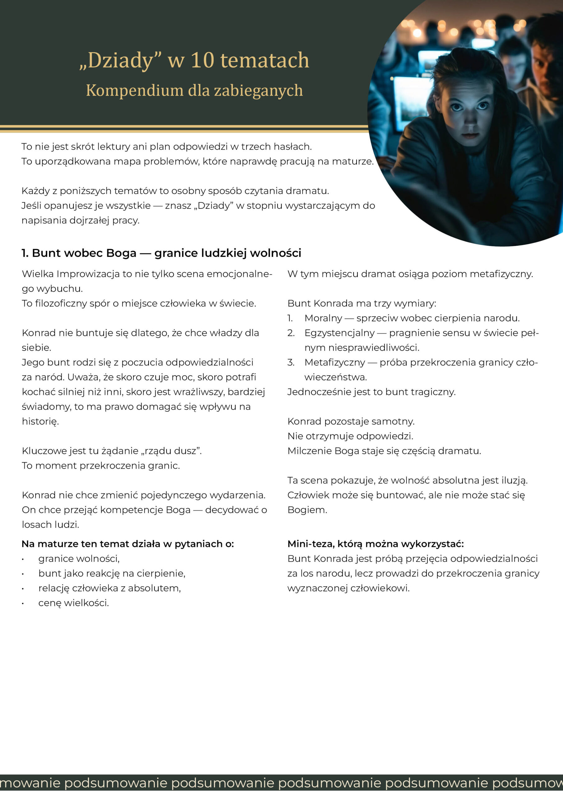 analizę najważniejszych motywów maturalnych (bunt, wolność, cierpienie, mesjanizm, władza, samotność),