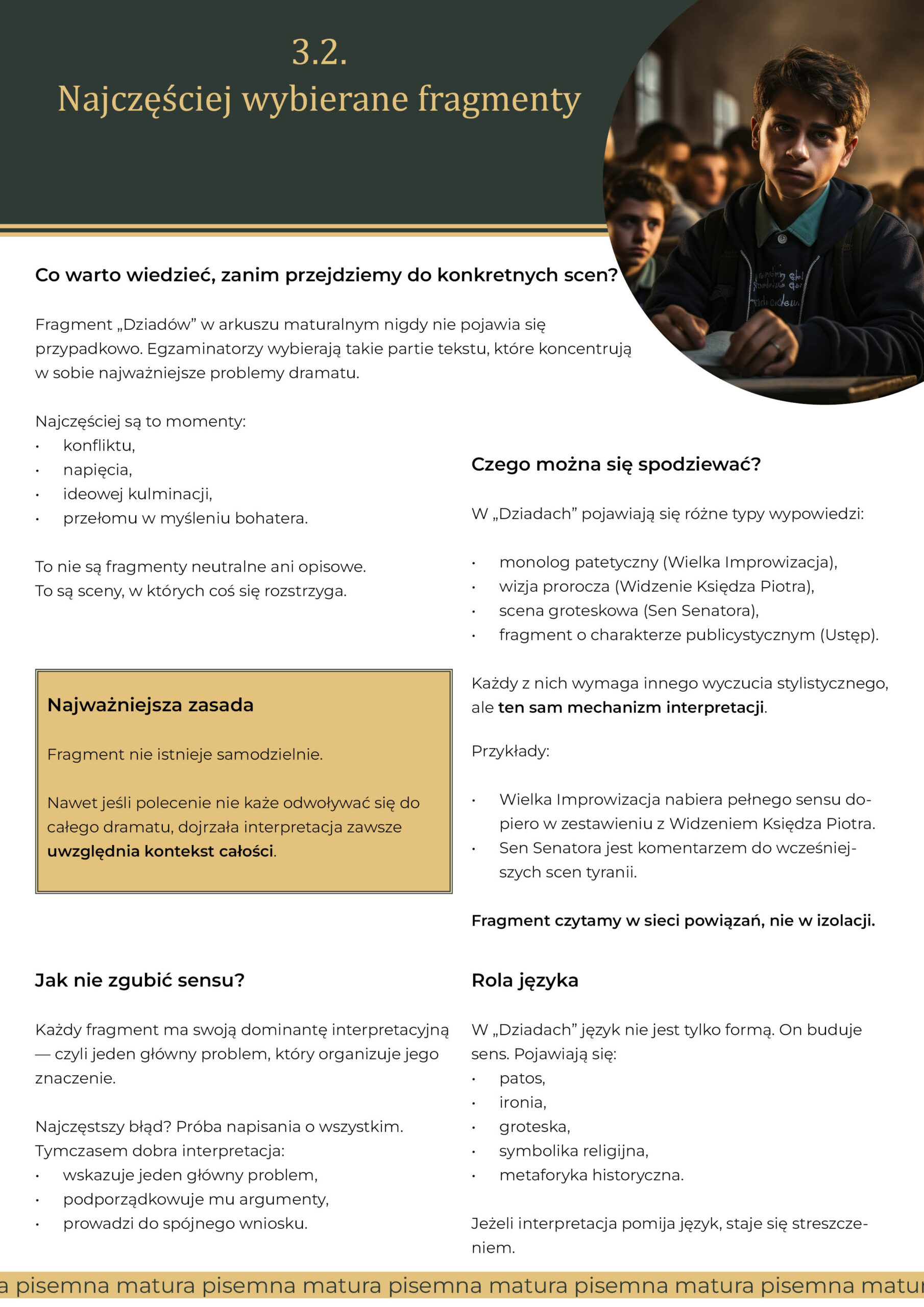 Publikacja zawiera również opracowanie pytań jawnych z „Dziadów”. Pokazuje, jak łączyć odpowiedzi ustne z wiedzą z części pisemnej i jak unikać schematycznych wypowiedzi.