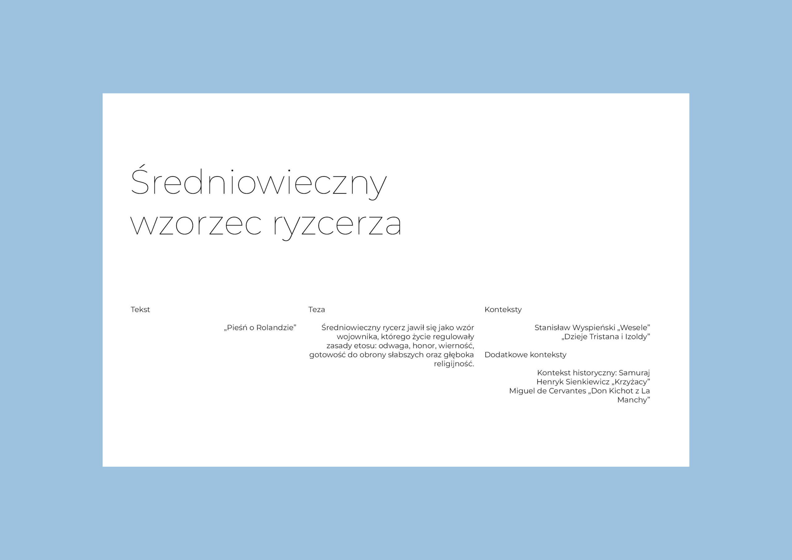 Od rycerza oczekiwano nie tylko odwagi na polu walki, lecz także wierności, prawości i kultury osobistej. Ideał rycerza kształtował się stopniowo, a jego wyraz znajdował przede wszystkim w literaturze parenetycznej, czyli w utworach ukazujących wzorce osobowe, które miały inspirować i wychowywać. Jednym z najpełniejszych świadectw średniowiecznego etosu rycerskiego jest francuska epopeja „Pieśń o Rolandzie”, gdzie bohater zostaje ukazany jako rycerz idealny – wzór męstwa, lojalności i chrześcijańskiego oddania.