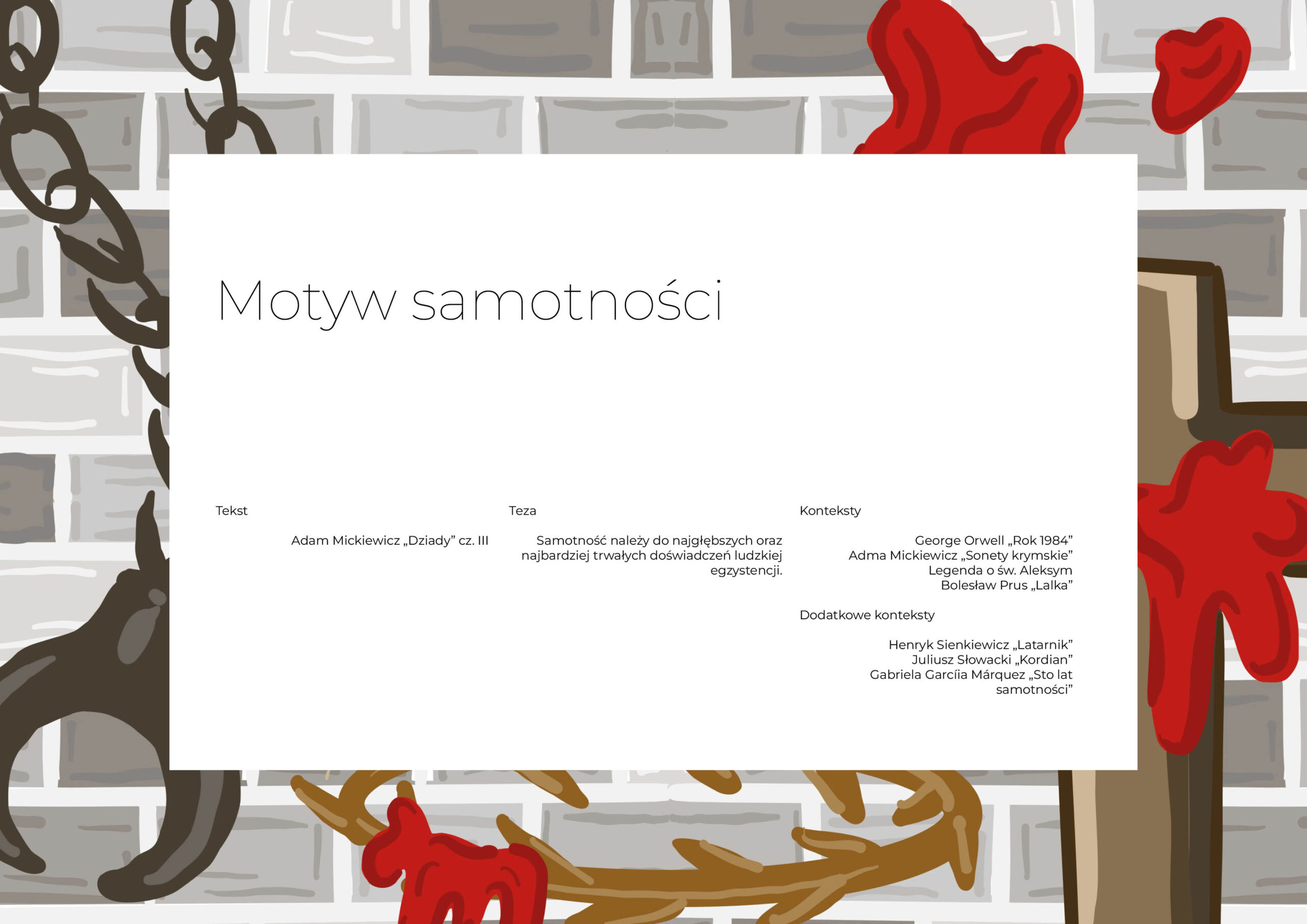 Samotność ma wiele oblicz – może być cicha i kojąca, ale również bolesna i przytłaczająca. Pojawia się nagle albo dojrzewa przez długi czas w duszy człowieka. Dla niektórych stanowi trudną do zniesienia formę izolacji, którą można złagodzić jedynie obecnością innych ludzi – rozmową, wspólną chwilą, poczuciem wspólnoty. Inni zaś odnajdują w samotności chwilę wytchnienia – ciszę, w której można porządkować emocje i własne myśli. W literaturze samotność bywa ukazywana zarówno jako fizyczne odosobnienie, jak i stan psychiczny, w którym bohater – mimo otoczenia ludźmi – czuje się niezrozumiany, obcy, wykluczony.
